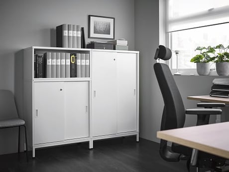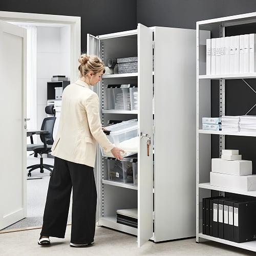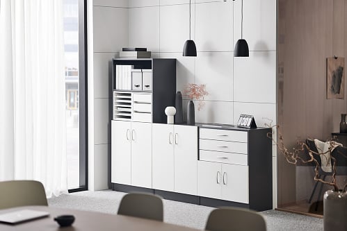 Choosing cabinets with adjustable sheving makes it easier to customize the storage to your needs, for example with extra shelves and smart inserts. For added functionality, you can also add document drawers and magazine files that make it easy to sort – and find – the things you want to save.